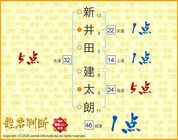 新(13画)井(4画)田(5画) 建(9画)太(4画)朗(11画)