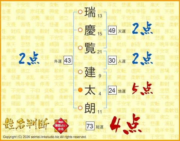 瑞(13画)慶(15画)覧(21画) 建(9画)太(4画)朗(11画)