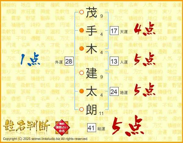 茂(9画)手(4画)木(4画) 建(9画)太(4画)朗(11画)