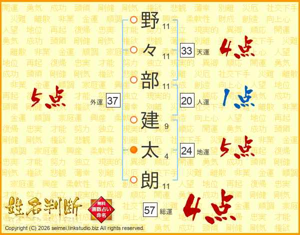 野(11画)々(11画)部(11画) 建(9画)太(4画)朗(11画)