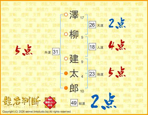 澤(17画)柳(9画) 建(9画)太(4画)郎(10画)