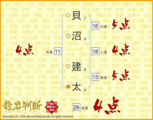 あなたの人生を表す1番重要な運勢です。生涯を通じて影響する総合運となり、主に50歳以降の晩年期に影響を及ぼします。苗字と名前の合計画数。