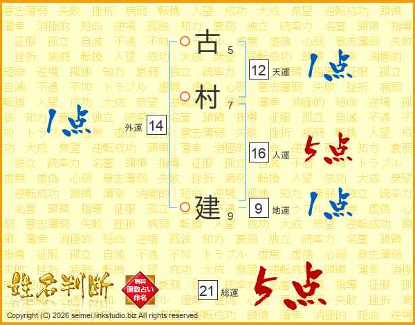 あなたの人生を表す1番重要な運勢です。生涯を通じて影響する総合運となり、主に50歳以降の晩年期に影響を及ぼします。苗字と名前の合計画数。