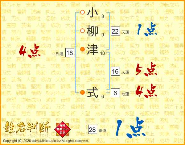 生活面を象徴する運勢です。外部から受ける影響力を表し、結婚運、家庭運や職場、環境への順応性を表します。総運から人運を引いた画数。姓や名が1文字の場合を除く。