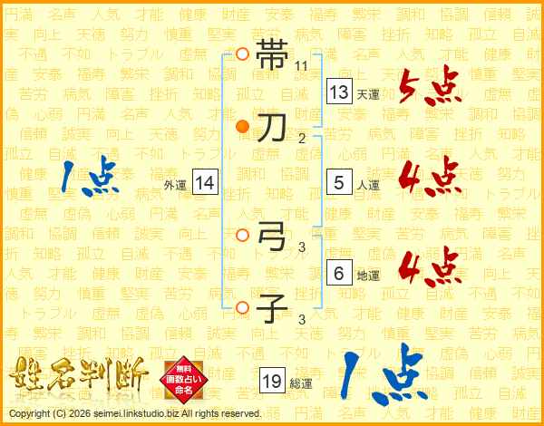 帯(11画)刀(2画) 弓(3画)子(3画)