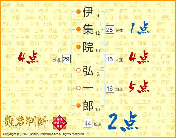 伊(6画)集(12画)院(10画) 弘(5画)一(1画)郎(10画)