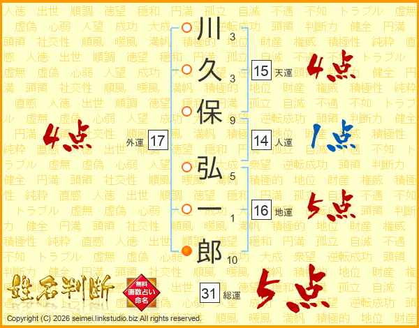 川(3画)久(3画)保(9画) 弘(5画)一(1画)郎(10画)