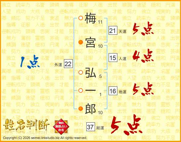 梅(11画)宮(10画) 弘(5画)一(1画)郎(10画)
