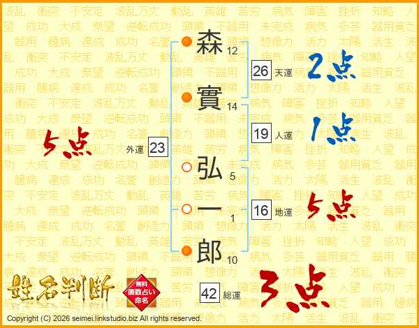 森(12画)實(14画) 弘(5画)一(1画)郎(10画)