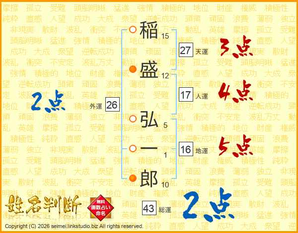稲(15画)盛(12画) 弘(5画)一(1画)郎(10画)