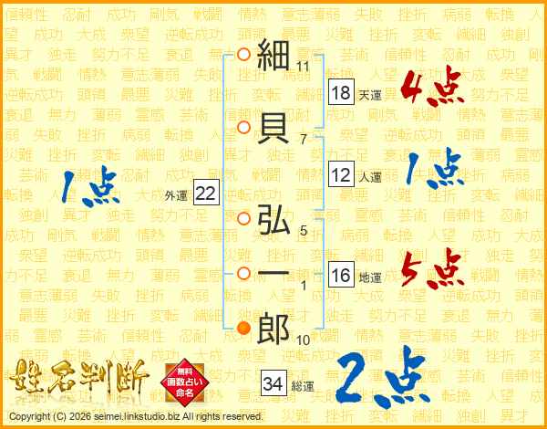 細(11画)貝(7画) 弘(5画)一(1画)郎(10画)