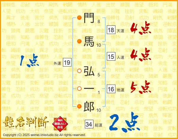 門(8画)馬(10画) 弘(5画)一(1画)郎(10画)