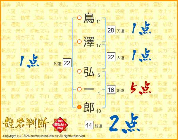 鳥(11画)澤(17画) 弘(5画)一(1画)郎(10画)