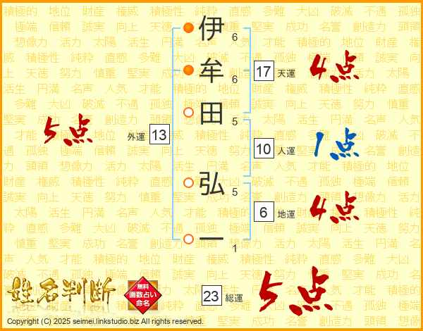 伊(6画)牟(6画)田(5画) 弘(5画)一(1画)