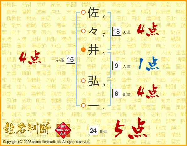 佐(7画)々(7画)井(4画) 弘(5画)一(1画)