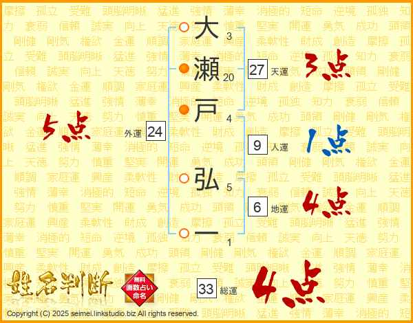 大(3画)瀬(20画)戸(4画) 弘(5画)一(1画)