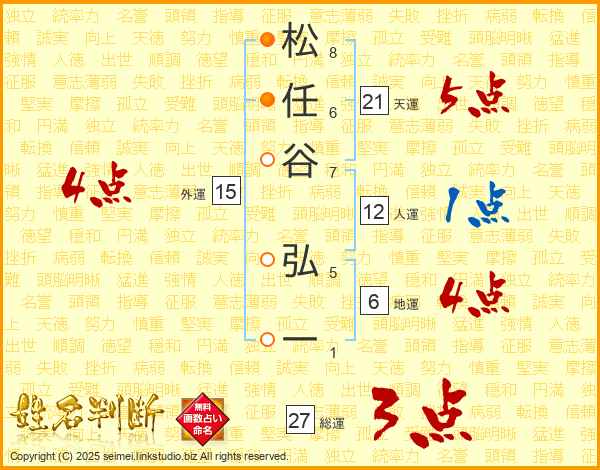 松(8画)任(6画)谷(7画) 弘(5画)一(1画)
