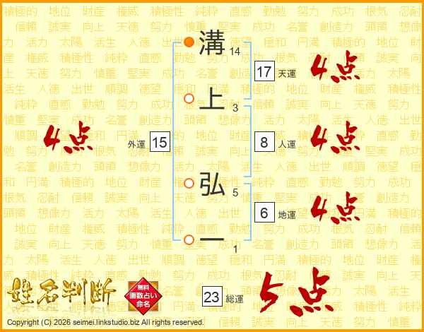 生活面を象徴する運勢です。外部から受ける影響力を表し、結婚運、家庭運や職場、環境への順応性を表します。総運から人運を引いた画数。姓や名が1文字の場合を除く。