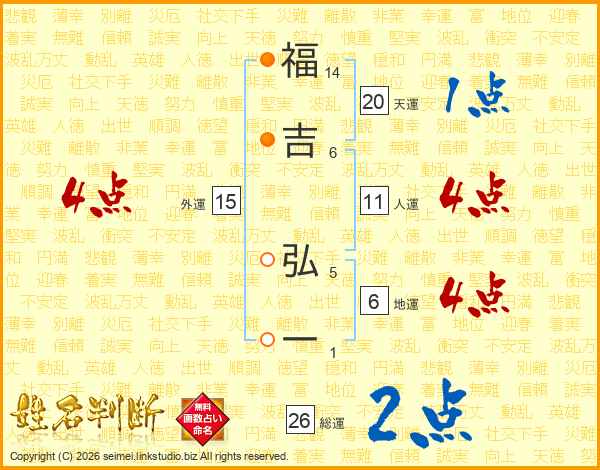 生活面を象徴する運勢です。外部から受ける影響力を表し、結婚運、家庭運や職場、環境への順応性を表します。総運から人運を引いた画数。姓や名が1文字の場合を除く。