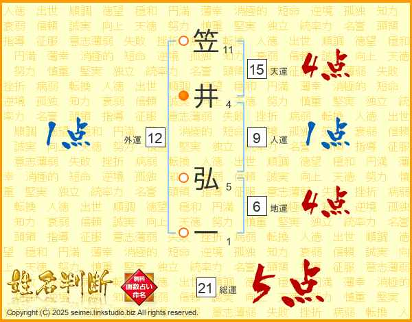 あなたの人生を表す1番重要な運勢です。生涯を通じて影響する総合運となり、主に50歳以降の晩年期に影響を及ぼします。苗字と名前の合計画数。