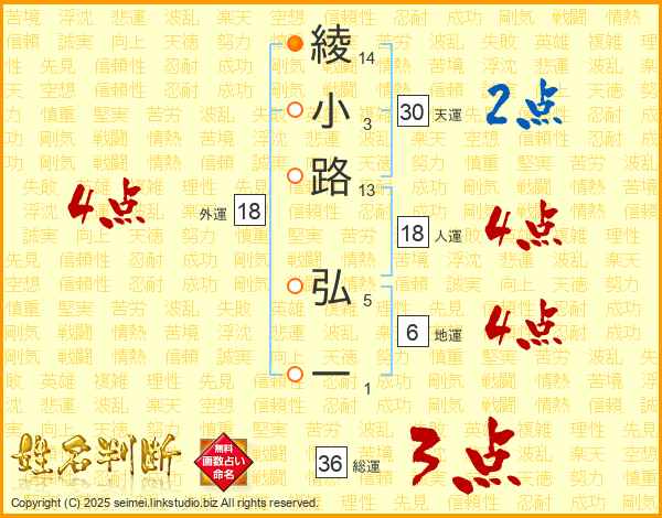綾(14画)小(3画)路(13画) 弘(5画)一(1画)