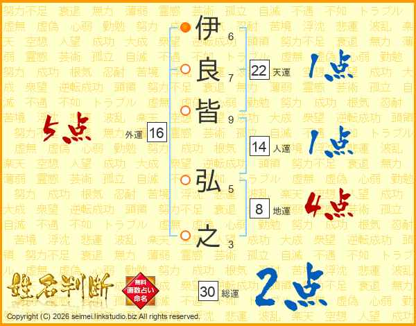 伊(6画)良(7画)皆(9画) 弘(5画)之(3画)