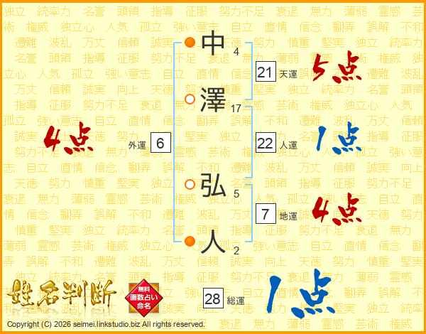 生活面を象徴する運勢です。外部から受ける影響力を表し、結婚運、家庭運や職場、環境への順応性を表します。総運から人運を引いた画数。姓や名が1文字の場合を除く。