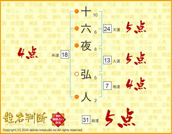 生活面を象徴する運勢です。外部から受ける影響力を表し、結婚運、家庭運や職場、環境への順応性を表します。総運から人運を引いた画数。姓や名が1文字の場合を除く。