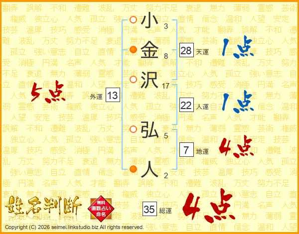 小(3画)金(8画)沢(17画) 弘(5画)人(2画)