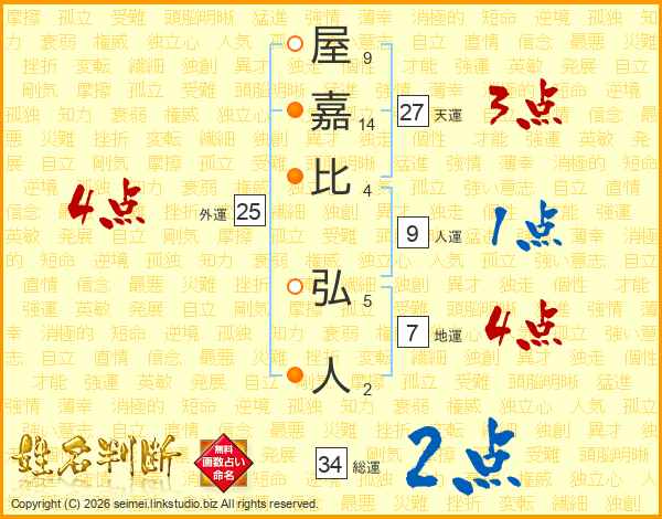 屋(9画)嘉(14画)比(4画) 弘(5画)人(2画)