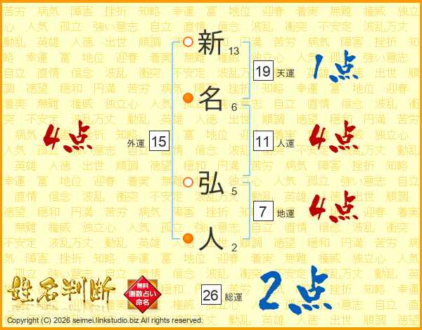 生活面を象徴する運勢です。外部から受ける影響力を表し、結婚運、家庭運や職場、環境への順応性を表します。総運から人運を引いた画数。姓や名が1文字の場合を除く。