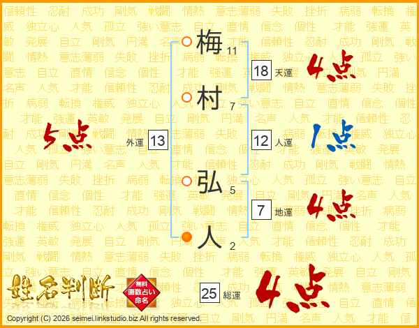 あなたの人生を表す1番重要な運勢です。生涯を通じて影響する総合運となり、主に50歳以降の晩年期に影響を及ぼします。苗字と名前の合計画数。