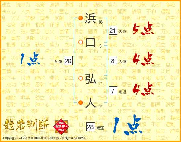 あなたの人生を表す1番重要な運勢です。生涯を通じて影響する総合運となり、主に50歳以降の晩年期に影響を及ぼします。苗字と名前の合計画数。