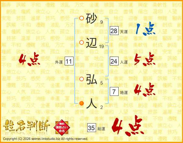 砂(9画)辺(19画) 弘(5画)人(2画)