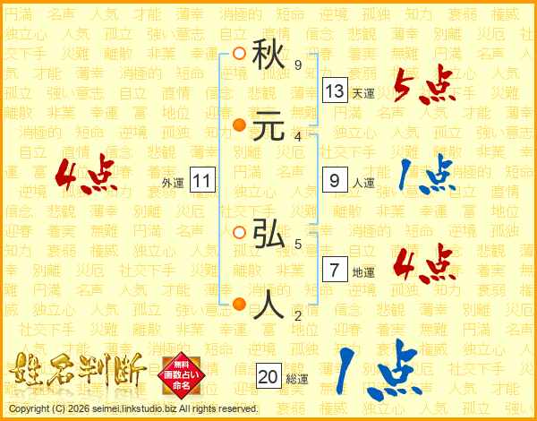 生活面を象徴する運勢です。外部から受ける影響力を表し、結婚運、家庭運や職場、環境への順応性を表します。総運から人運を引いた画数。姓や名が1文字の場合を除く。