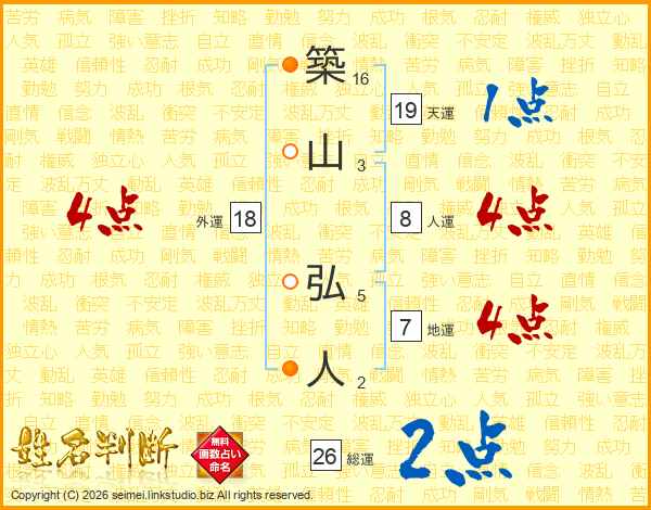 生活面を象徴する運勢です。外部から受ける影響力を表し、結婚運、家庭運や職場、環境への順応性を表します。総運から人運を引いた画数。姓や名が1文字の場合を除く。