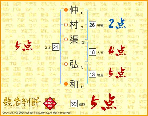 仲(6画)村(7画)渠(13画) 弘(5画)和(8画)