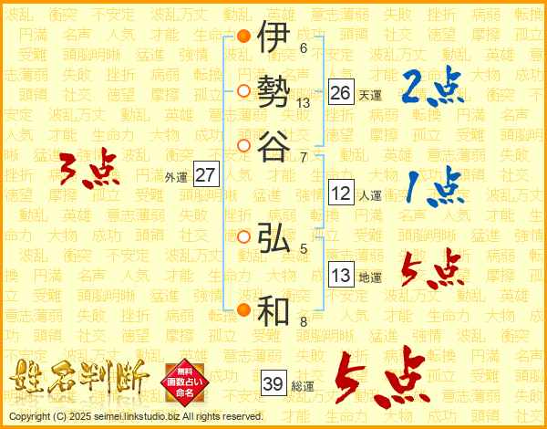 伊勢谷弘和さんの総運は39画の5点!