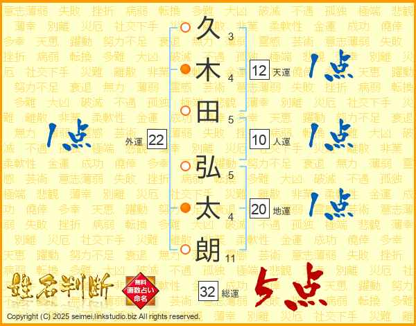 久(3画)木(4画)田(5画) 弘(5画)太(4画)朗(11画)