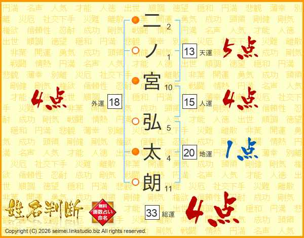 二ノ宮弘太朗さんの総運は33画の4点!