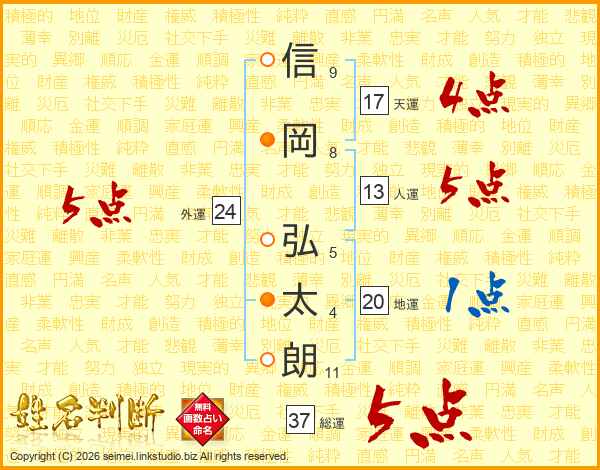 信(9画)岡(8画) 弘(5画)太(4画)朗(11画)