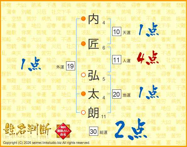 内(4画)匠(6画) 弘(5画)太(4画)朗(11画)