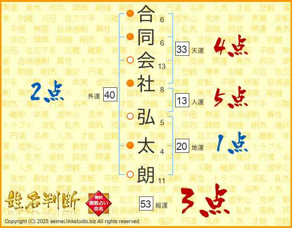合(6画)同(6画)会(13画)社(8画) 弘(5画)太(4画)朗(11画)