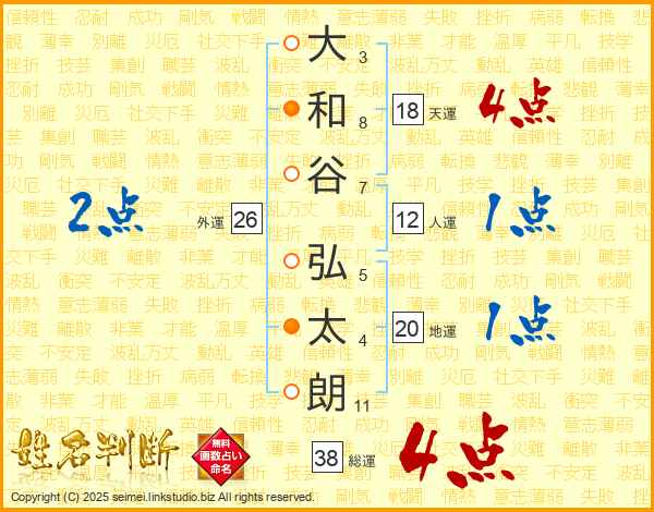 大(3画)和(8画)谷(7画) 弘(5画)太(4画)朗(11画)