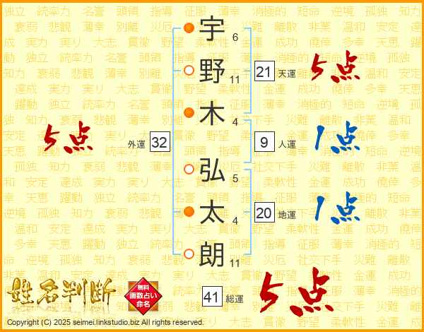 宇(6画)野(11画)木(4画) 弘(5画)太(4画)朗(11画)