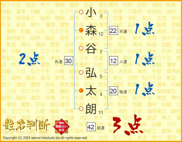 小(3画)森(12画)谷(7画) 弘(5画)太(4画)朗(11画)