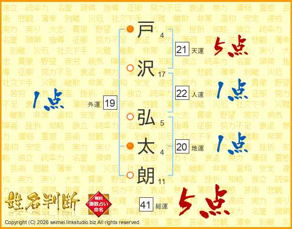 戸(4画)沢(17画) 弘(5画)太(4画)朗(11画)