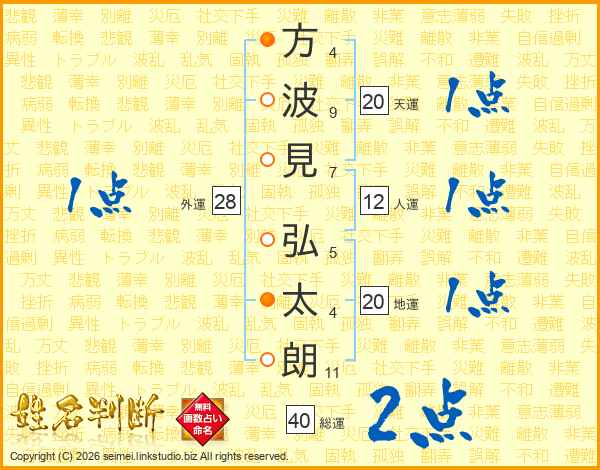 方(4画)波(9画)見(7画) 弘(5画)太(4画)朗(11画)