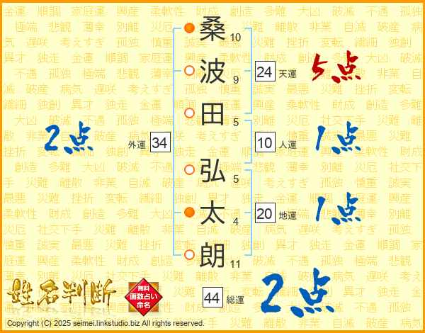 桑(10画)波(9画)田(5画) 弘(5画)太(4画)朗(11画)