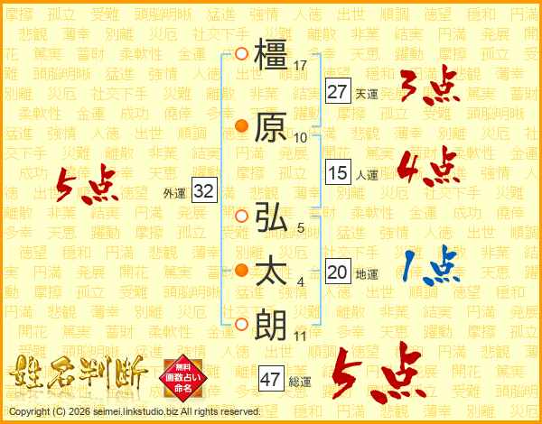 橿(17画)原(10画) 弘(5画)太(4画)朗(11画)